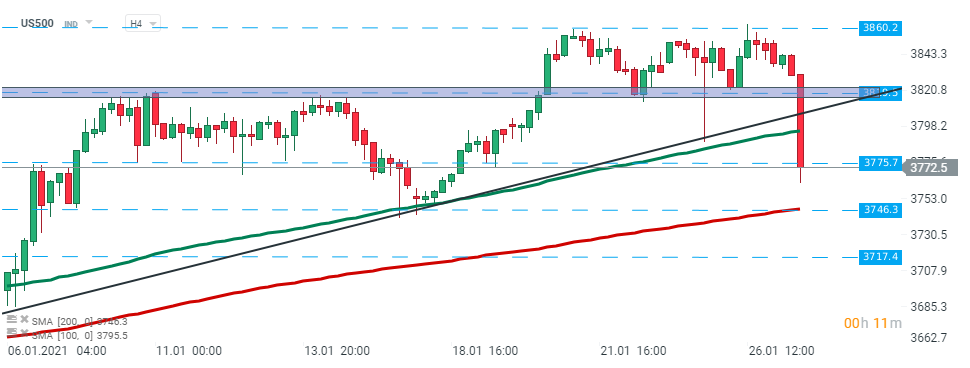 US 500 - indicele a spart sub linia ascendentă de trend, a depășit în jos media mobilă de 50 de perioade (linia verde) dar și suportul de la 3.775 de puncte. Dacă prevalează sentimentul actual, atunci suportul de la 3.746 puncte ar putea fi în pericol. Pe de altă parte, în cazul în care cumpărătorii reușesc să aducă prețul deasupra liniei de trend menționate anterior, atunci ar putea fi lansată o altă mișcare ascendentă către maximul istoric de la 3.860 de puncte. Sursa: xStation5