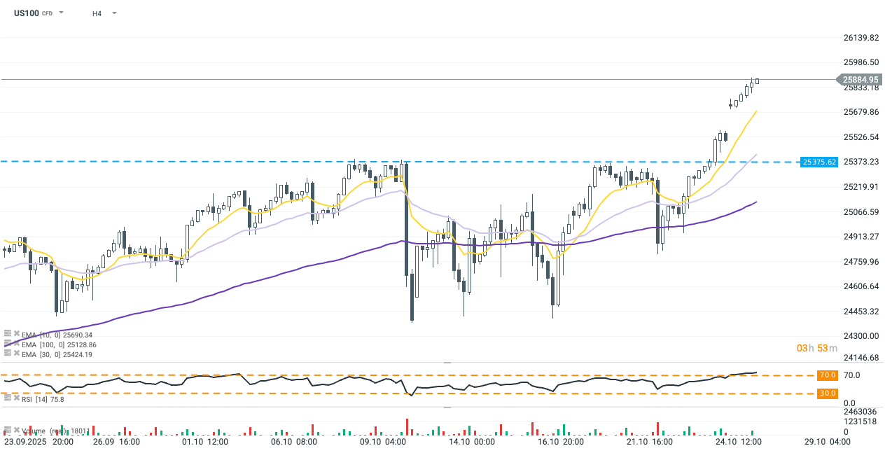 Contractele futures Nasdaq 100 au deschis astăzi în creștere, câștigând încă 0,6%. Indicele RSI a intrat în zona de supra-cumpărare, dar optimismul legat de negocierile comerciale dintre SUA și China și de rezultatele financiare importante ale marilor companii tehnologice ar putea determina o creștere și mai mare a prețurilor. Contractul se tranzacționează cu mult peste rezistența recentă de la 25.375, ceea ce înseamnă că orice retragere ar testa probabil mai întâi media mobilă exponențială pe 10 perioade (EMA10) pe graficul H4.