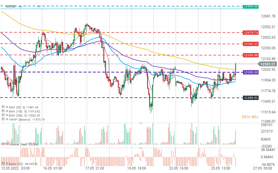 Indicele US100, interval H1. Benchmark-ul companiilor de tehnologie a început sesiunea de astăzi cu câștiguri. Cumpărătorii au împins prețul peste bariera psihologică de 12.000 de puncte și se îndreaptă acum spre rezistența situată în zona de 12.200 de puncte . În acest moment, cel mai apropiat suport poate fi considerat media mobilă exponențială de 200 de perioade (linia galbenă) și nivelul menționat anterior de 12.000 de puncte. Sursa: xStation 5