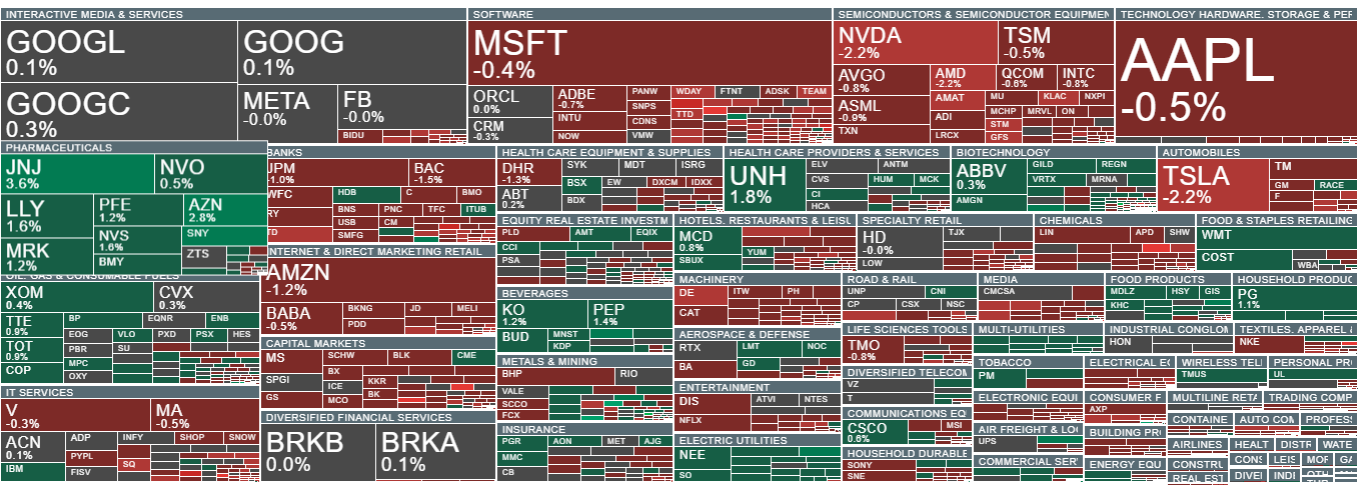 Acțiuni din indicele S&P 500 clasificate pe sectoare și industrii. Mărimea reprezintă capitalizarea bursieră. Starea de spirit din sectorul farmaceutic este covârșitor de pozitivă, companiile de tehnologie din industria semiconductorilor înregistrează vânzări. Sursa: xStation5