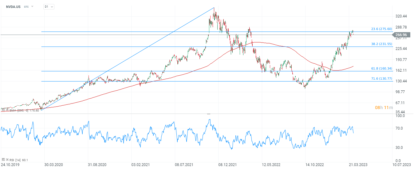 Acțiunile Nvidia (NVDA.US) au deschis sesiunea de astăzi cu un gap descendent. Prețul a reacționat cu o scădere în apropierea retragerii Fibonacci de 23,6% a valului ascendent inițiat în martie 2020, făcând încă posibil un test al retragerii Fibonacci de 38,2%, situată la nivelul de 230 USD pe acțiune. Sursa: xStation5