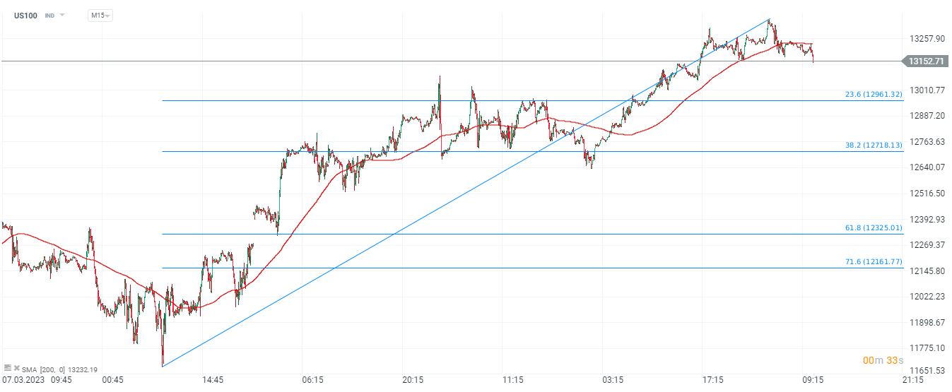 US100 pierde la începutul sesiunii, dar taurii pot riposta. Cumpărătorii nu au reușit să depășească media mobilă de 200 de perioade(linia roșie) astfel un test al nivelului 13.000 de puncte unde se află retragerea Fibonacci de 23,6% a valului ascendent, inițiat la jumătatea lunii martie, nu iese din discuție. Sursa: xStation5