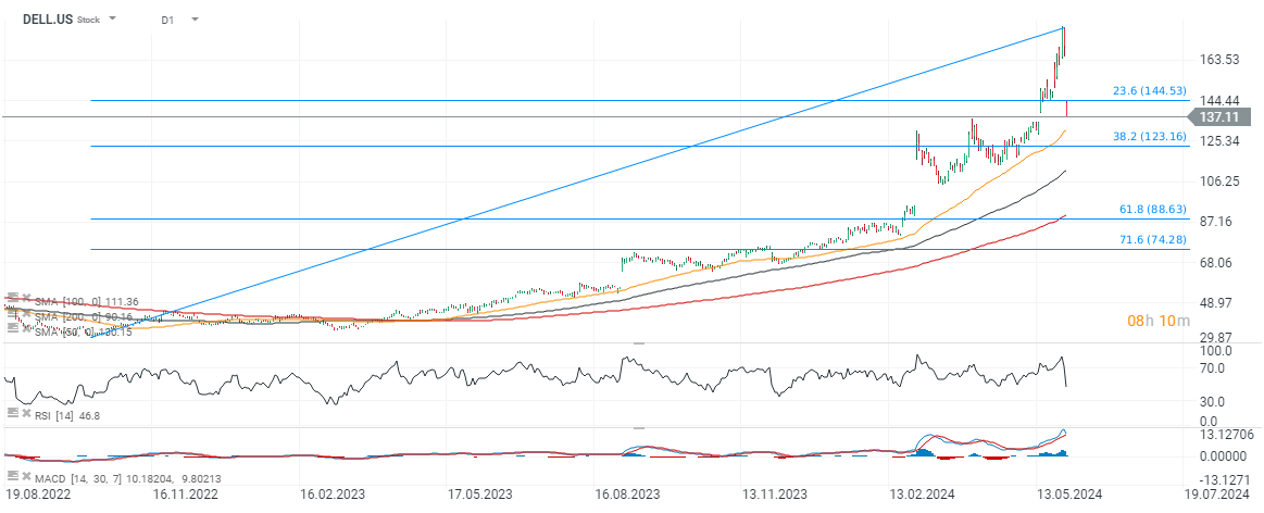 - Acțiunile Dell (DELL.US) se confruntă astăzi cu o vânzare de 20%, deoarece câștigurile trimestriale au fost sub previziuni, iar compania a semnalat costuri mai mari, din cauza construcției de servere AI, ceea ce va comprima, pe bună dreptate, marjele. Potrivit companiei, marjele vor scădea cu 150 de puncte de bază în primul trimestru fiscal 2025. Compania se așteaptă la un profit pe acțiune de 1,65 dolari, cu o toleranță de 10 cenți în ambele sensuri, în trimestrul curent. Analiștii se așteptau la 1,84 dolari. În același timp, Dell și-a majorat previziunile privind veniturile pentru întregul an 2025 între 93,5 și 97,5 miliarde de dolari, față de așteptările Wall Street de 91-95 miliarde de dolari, semnalând că investițiile în inteligența artificială s-ar putea dovedi în cele din urmă profitabile într-un moment în care activitatea de bază continuă să crească.