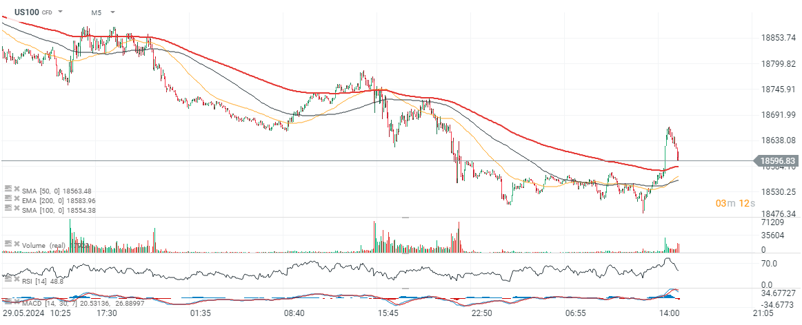 Reacția euforică a pieței bursiere nu a durat mult, iar Wall Street a încetat să se mai bucure de datele PCE la câteva momente după deschiderea pieței. Acțiunile tehnologice pierd astăzi. O slăbiciune evidentă este evidentă astăzi în cazul ADR-urilor acțiunilor chinezești, inclusiv Alibaba (BABA.US) și PDD Holdings (PDD.US), care alunecă odată cu corecția deja de aproape 10% a indicelui Hang Seng, care a avut loc în ultimele 10 zile. Datele PCE nu dau prea multe iluzii pieței și reasigură că principala măsură a inflației nu va coborî la ținta de 2% în acest an, oferind Rezervei Federale un argument pentru o politică „mai restrictivă pentru mai mult timp”.