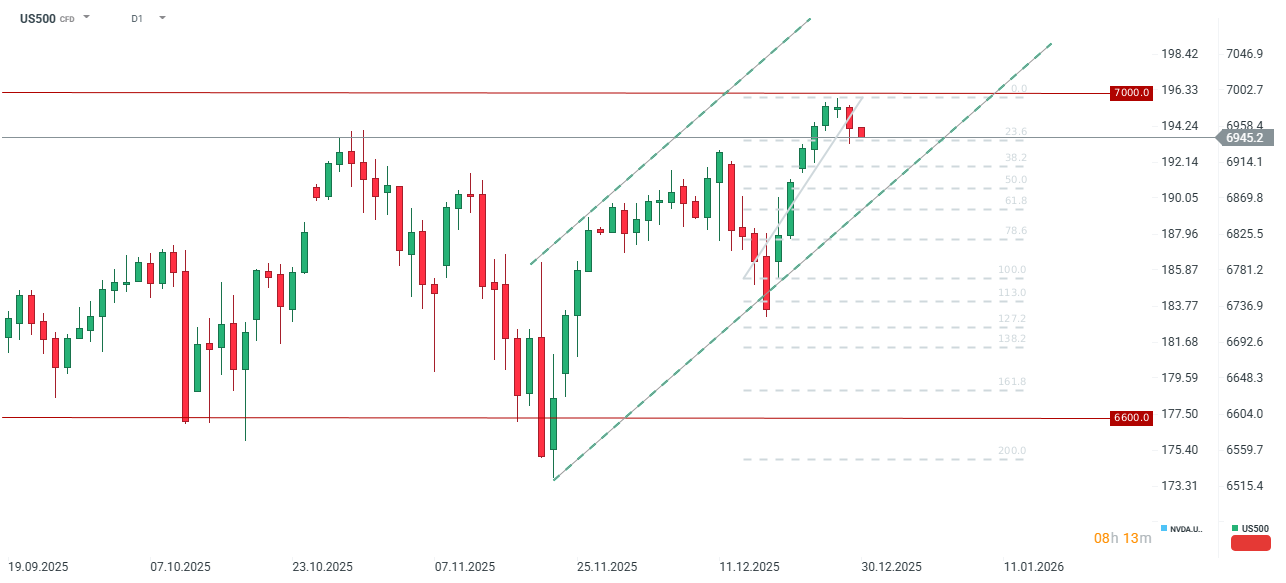 Contractele futures US500 continuă să înregistreze o tendință descendentă, în ciuda unei recuperări parțiale față de minimele intraday de ieri. Investitorii rămân în așteptare înainte de publicarea raportului FOMC. US500 se tranzacționează în prezent puțin sub pragul de 6.950 de puncte, rămânând peste retragerea Fibonacci de 23,6% a tendinței bullish ulterior rulării. Dacă profiturile vor continua să scadă după un an 2025 robust, o încălcare a nivelului actual de suport ar putea determina indicele să scadă spre 6.888 de puncte, un nivel aliniat cu retragerea Fibonacci de 50,0% și linia principală de tendință ascendentă.