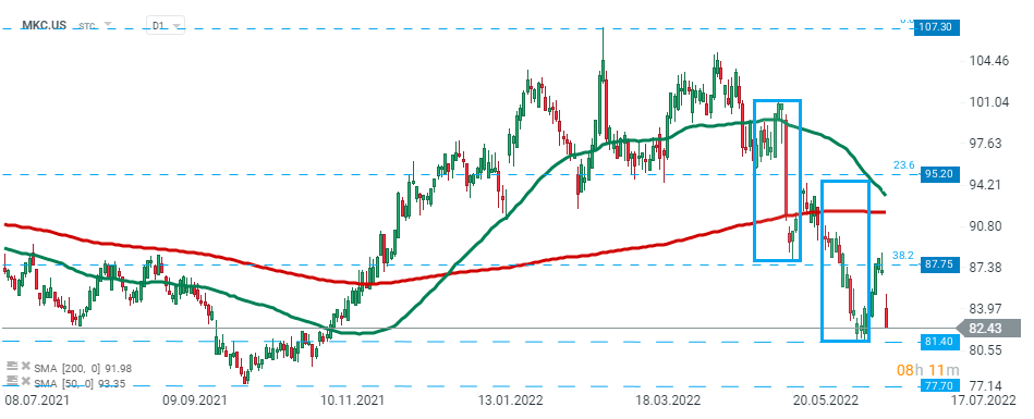 Acțiunile McCormick (MKC.US) au deschis sesiunea de astăzi cu un gap de preș negativ iar prețul se apropie de suportul de la 81,40 USD, unde se află minimele recente. În cazul în care acest prag este depășit, mișcarea descendentă poate accelera către următorul suport, cel de la 77,70 USD. Cea mai apropiată rezistență de urmărit se află la 87,75 USD și coincide cu retragerea Fibonacci de 38,2% a mișcării ascendente începute în martie 2020. Sursa: xStation5