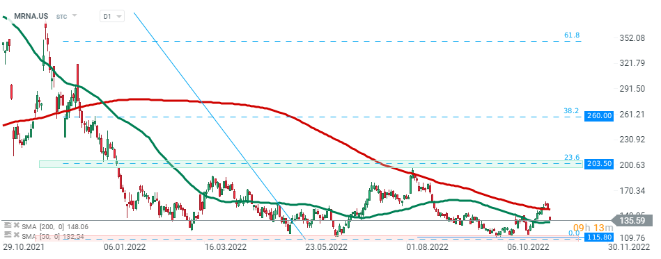 Acțiunile Moderna (MRNA.US) au scăzut cu 75,0% față de maximele din august 2021 iar prețul a testat recent zona cheie de suport de 115,80 USD. La sfârșitul lunii octombrie, cumpărătorii au devenit mai activi, cu toate acestea, politica “hawkish” a Fed și rezultatele trimestriale slabe au oferit mai mult combustibil pentru vânzători. Dacă sentimentul actual predomină, mișcărea de scădere poate continua spre zona de suport menționată anterior. Sursa: xStation5