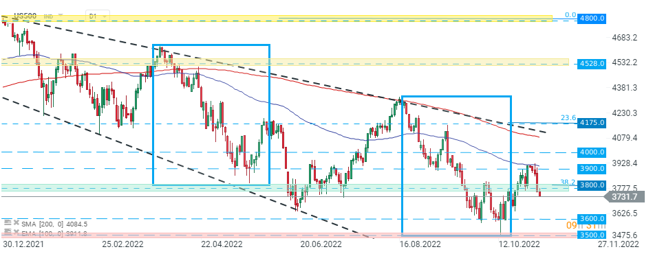 US500 extinde recenta mișcare descendentă și coboară sub suportul major de 3.800 de puncte, nivel care coincide cu retragerea Fibonacci de 38,2% a valului ascendent lansat în martie 2020. În cazul în care sentimentul actual va predomina, impulsul descendent poate accelera spre suportul de 3.500 de puncte, prag care este marcat cu limita inferioară a structurii 1:1. Sursa: xStation5