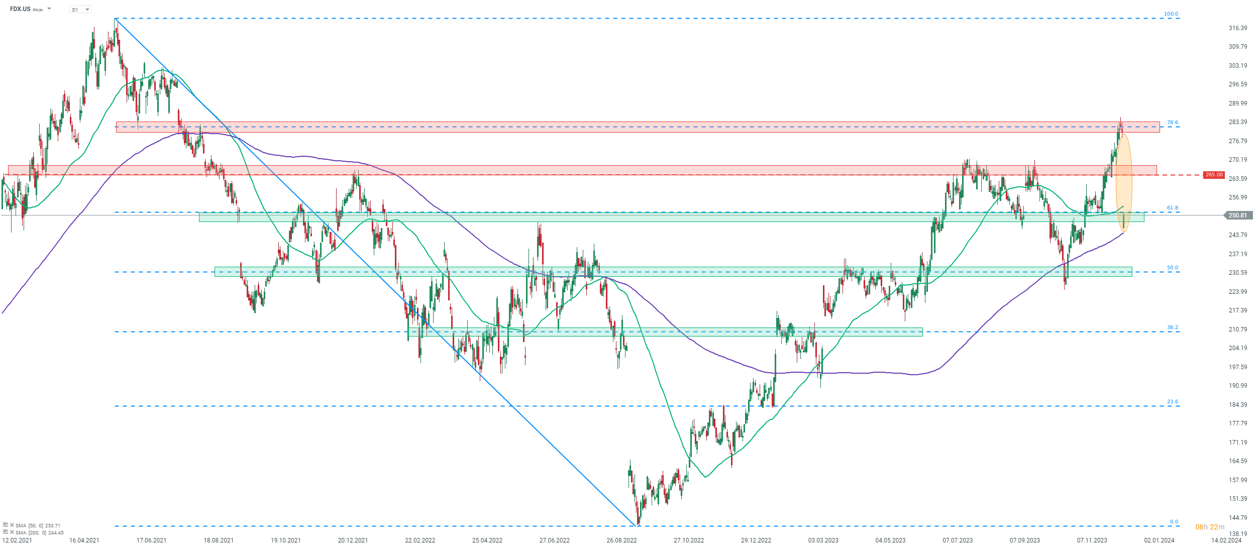 FedEx (FDX.US) a pierdut astăzi aproximativ 12% la deschiderea sesiunii de numerar, după publicarea unor rezultate dezamăgitoare pentru trimestrul II fiscal 2024. Acțiunile s-au retras din zona de rezistență, marcată cu retragerea Fibonacci de 78,6% a mișcării descendente lansate în 2021, și prețul a alunecat sub zona de suport marcată cu retragerea Fibonacci de 61,8%. O tentativă de revenire peste acest obstacol poate fi observată la ora transmiterii acestei știri. Sursa: xStation 5