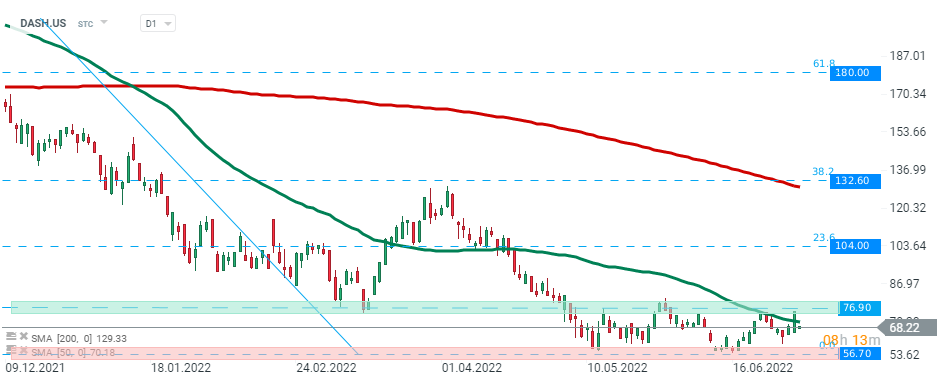 Acțiunile DoorDash (DASH.US) s-a deplasat lateral de la mijlocul lunii mai. Ieri prețul a crescut brusc, cu toate acestea, cumpărătorii nu au reușit să depășească limita superioară a consolidării de 76,90 USD. Știrile de astăzi au pus o presiune suplimentară pe vânzare, iar minimele locale de la 56,70 USD par a fi cea mai apropiată țintă pentru vânzători. Sursa: xStation5
