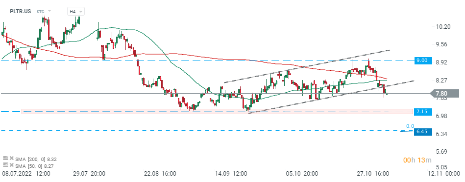 Acțiunile Palantir Technologies (PLTR.US) au scăzut vineri sub limita inferioară a structurii 1:1, iar noile rezultate trimestriale au accelerat mișcarea descendentă. Dacă sentimentul actual predomină, prețul s-ar putea îndrepta către suportul de la 7,15 USD, unde se află minimele recente. Sursa: xStation5