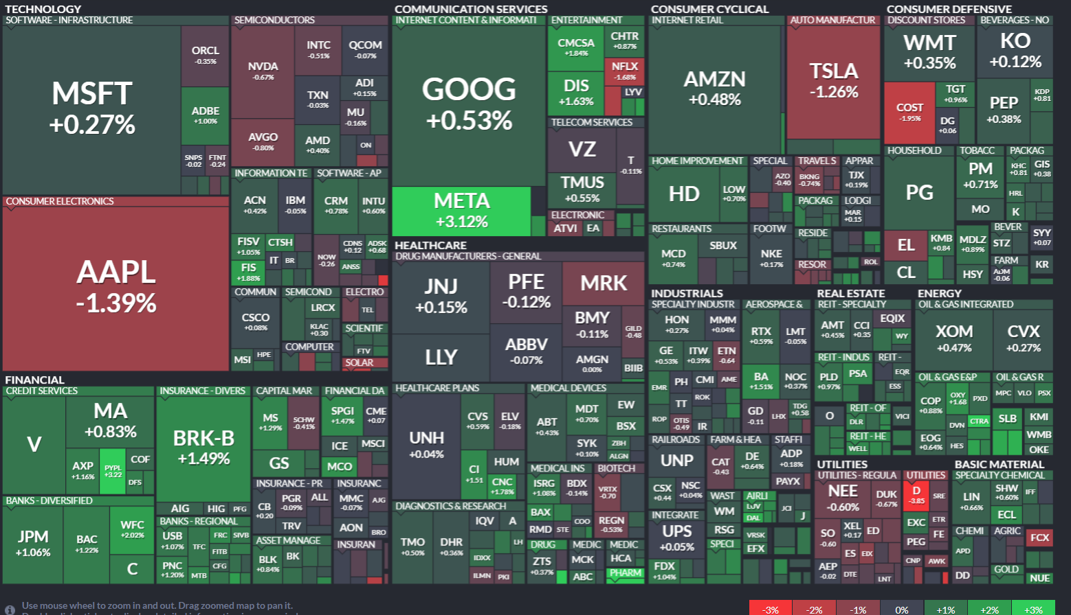 Acțiunile indicelui S&P500 clasificate pe sectoare și industrii. Mărimea reprezintă capitalizarea de piață. Sursa: Finviz