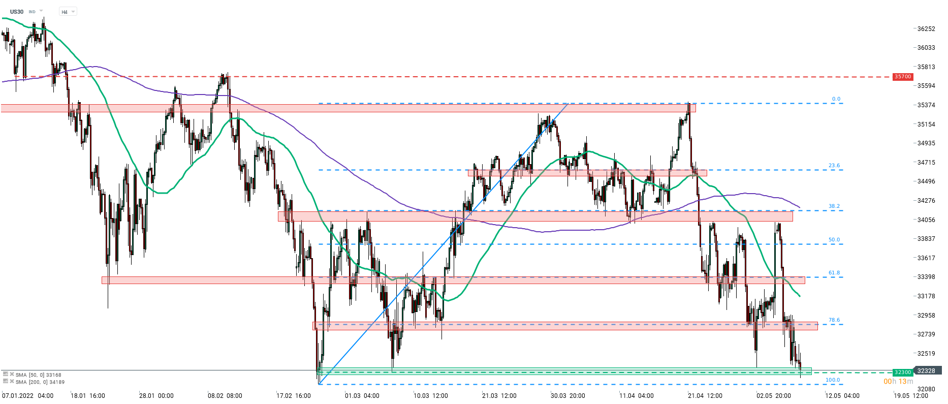 Dow Jones (US30) continuă astăzi vânzările de săptămâna trecută, cu o altă scădere de peste 1%. US30 a făcut un alt test al zonei de suport de la 32.300 de puncte în această dimineață, dar până acum vânzătorii nu au reușit să ducă prețul decisiv sub acest nivel. Indicele a încercat să recupereze teren în urma unei deschideri în scădere a sesiunii, dar mișcarea nu are impuls. În cazul în care cumpărătorii recâștigă controlul și indicele avansează, prima rezistență pe termen scurt de urmărit este marcată de retragerea Fibonacci de 78,6% a mișcării ascendente, începute la sfârșitul lui aprilie 2022.