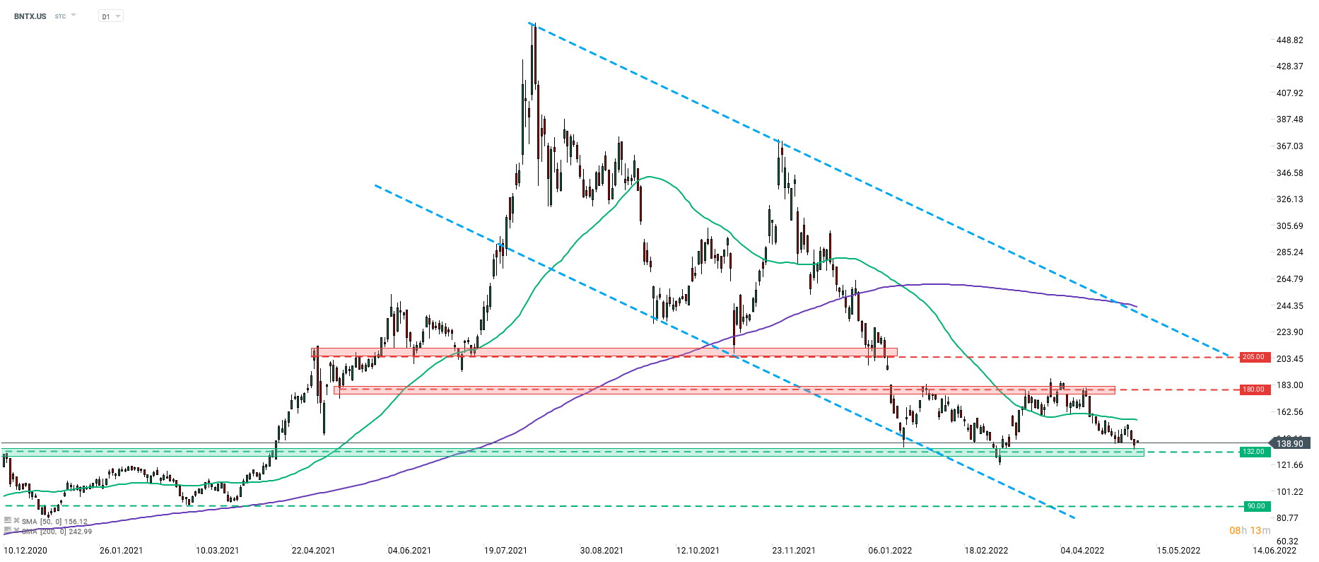 BionTech (BNTX.US) a deschis sesiunea de astăzi fără modificări majore, în ciuda publicării rezultatelor trimestriale. Compania a raportat rezultate solide, dar a avertizat că se așteaptă ca cererea pentru vaccinul său Covid să slăbească mai târziu în cursul anului. Acțiunile se tranzacționează ușor peste zona de suport de 132,00 USD și aproape de punctul de mijloc al unui canal larg descendent. Dacă vânzătorii vor reuși să împingă prețul sub suportul de 132 USD, o scădere spre suportul de 90 USD ar putea fi în cărți. Sursa: xStation5