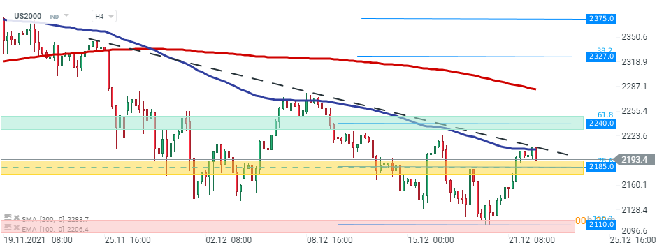 US2000 - vânzătorii nu au reușit să depășească suportul major de la 2.100 de puncte la începutul săptămânii, iar indicele s-a apreciat semnificativ în timpul sesiunii de ieri. Cu toate acestea, în acest moment, cumpărătorii se luptă să depășească linia de tendință descendentă care coincide cu media exponențială de 100 de perioade (linia mov). Atâta timp cât prețul este mai jos, ar putea fi lansată o altă mișcare descendentă către suportul menționat anterior. Pe de altă parte, în cazul în care se produce o spargere în sus, mișcarea ascendentă poate accelera spre rezistența de la 2.240, care este întărită cu retragerea Fibonacci de 61,8% a ultimului val ascendent lansat în august 2021. Sursa: xStation5