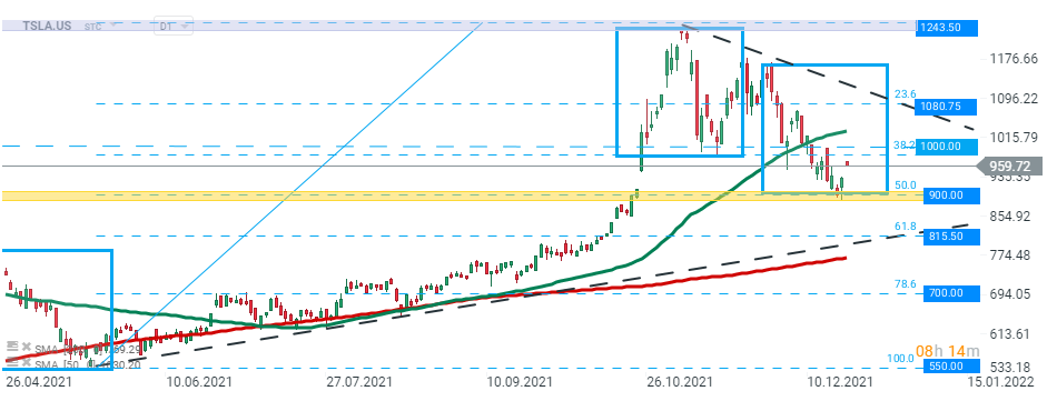 Acțiunile Tesla (TSLA.US) au fost sub presiune în ultimele săptămâni, totuși se pare că toți cumpărătorii au reușit să oprească declinul din jurul suportului major din jurul valorii de 900,00 USD, suport marcat cu limita inferioară a structurii 1:1 și retragere Fibonacci de 50% a ultimului val ascendent. Dacă sentimentul actual prevalează, următoarea țintă pentru tauri este situată la nivelul psihologic de 1000,00 USD. Pe de altă parte, în cazul în care se produce o spargere în jos, atunci mișcarea descendentă poate accelera către următorul suport, cel situat la 815,00 USD, care coincide cu retragerea Fibonacci de 61,8%. Sursa: xStation5