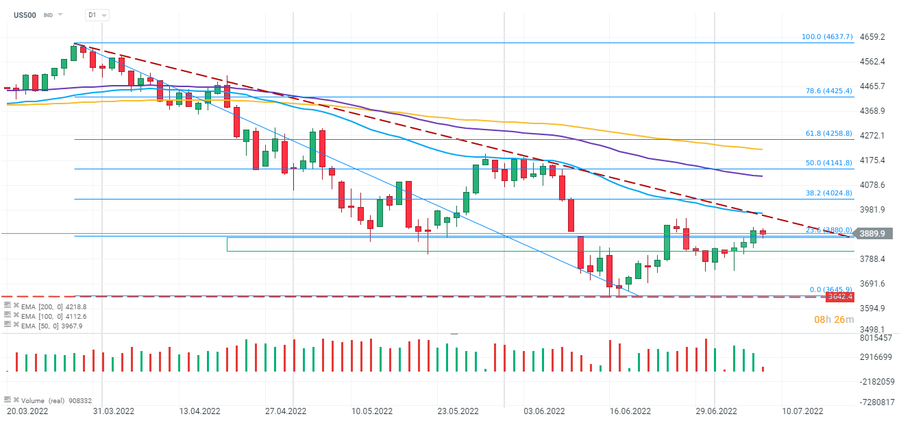 Acțiunile americane încep sesiunea de astăzi cu scăderi, indicele US500 luptându-se să rămână deasupra suportului oferit de retragerea Fibonacci de 23,6% a valului descendent care a început la sfârșitul lunii martie 2022. Sursa: xStation 5