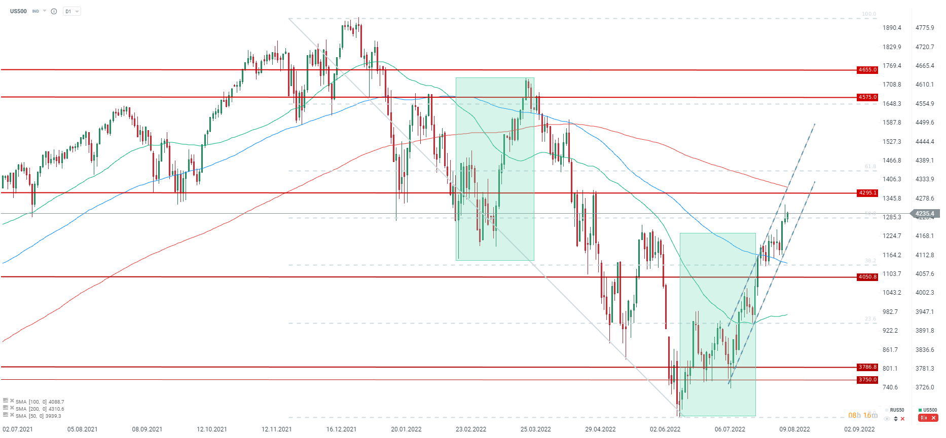 US500 este poziționat pentru o altă săptămână terminată în teritoriul pozitiv, în principal din cauza semnelor de răcire a inflației. După pierderea marginală de ieri, indicele S&P 500 a început sesiunea cu aproximativ 0,5% mai sus. US500 (S&P 500 fut.) este încă ușor deasupra retragerii Fibonacci de 50% a întregului val descendent din prima jumătate a anului. Cumpărătorii pare că țintesc nivel de 4.300 de puncte și media mobilă de 200 de de perioade, care este puțin deasupra rezistenței menționate. Pe de altă parte, cea mai apropiată zonă de suport este cuprinsă între 4.180 și 4.200. Mai mult, valul actual de corecție ar trebui să fie intact atâta timp cât prețul rămâne în canalul de trend ascendent. Sursa: xStation5