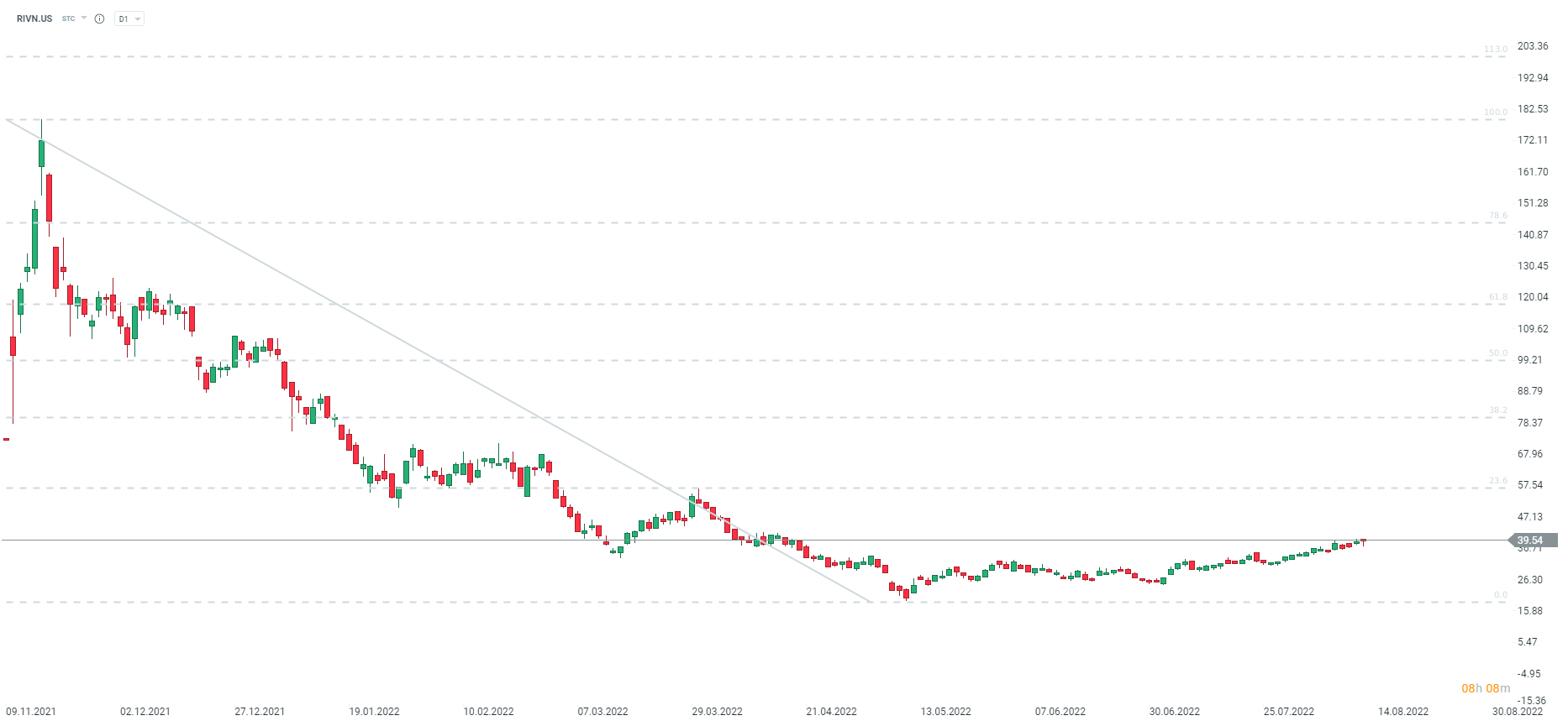 Rivian este aproape de pragul de 40 USD pe acțiune și cu peste 100% mai sus față de minimul istoric din mai. Cu toate acestea, prețul este încă cu aproximativ 80% mai mic decât maximul istoric, iar impulsul nu este destul de puternic. Rezistența cheie este la aproximativ 58 USD pe acțiune, aproape de retragerea Fibonacci de 23,6%. Pe de altă parte, cel mai apropiat suport poate fi găsit în zona 29 - 30 USD per acțiune. Sursa: xStation5