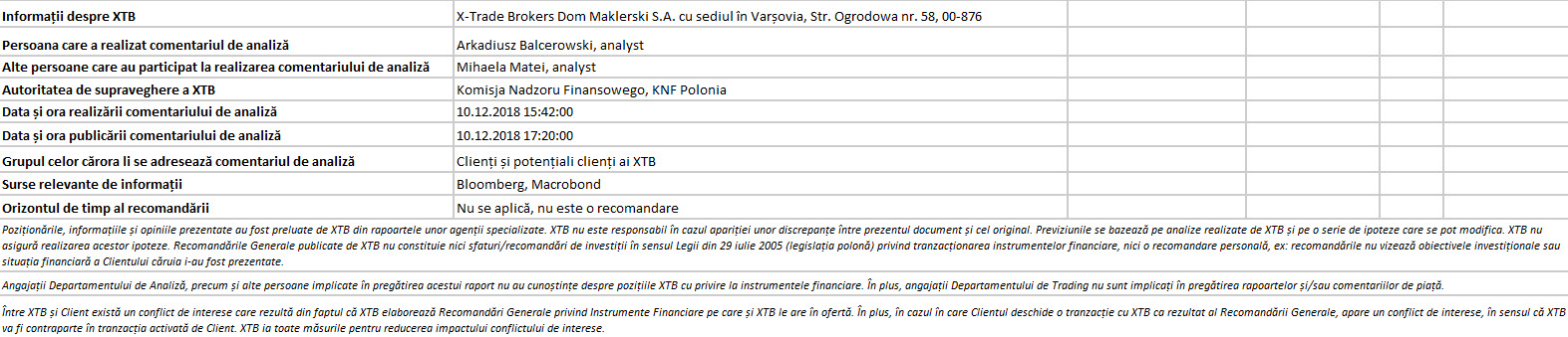 "Acest material este o comunicare de marketing în sensul articolului 24 alineatul (3) din Directiva 2014/65 / UE a Parlamentului European și a Consiliului din 15 mai 2014 privind piețele de instrumente financiare, și de modificare a Directivei 2002/92 / CE și a Directivei 2011 / 61 / UE (MiFID II). Comunicarea de marketing nu este o recomandare de investiții sau o recomandare de informații sau o recomandare care sugerează o strategie de investiții în sensul Regulamentului (UE) nr. 596/2014 al Parlamentului European și al Consiliului din 16 aprilie 2014 privind abuzul de piață ( reglementarea abuzului de piață) și de abrogare a Directivei 2003/6 / CE a Parlamentului European și a Consiliului și a Directivelor Comisiei 2003/124 / CE, 2003/125 / CE și 2004/72 / CE și a Regulamentului delegat (UE) 2016/958 al Comisiei din 9 596/2014 al Parlamentului European și al Consiliului în ceea ce privește standardele tehnice de reglementare pentru aranjamentele tehnice pentru prezentarea obiectivă a recomandărilor de investiții sau a altor informații care sugerează strategii de investiții și pentru dezvăluirea de interese particulare sau indicații de conflicte de interese sau orice alte sfaturi, inclusiv în domeniul consultanței în materie de investiții, în sensul Legii privind tranzacționarea cu instrumente financiare din 29 iulie 2005 (de ex. Journal of Laws 2019, articolul 875, astfel cum a fost modificat). Comunicarea de marketing este pregătită cu cea mai mare diligență, obiectivitate, prezintă faptele cunoscute autorului la data pregătirii și este lipsită de orice elemente de evaluare. Comunicarea de marketing este pregătită fără a lua în considerare nevoile clientului, situația sa financiară individuală și nu prezintă nicio strategie de investiții în niciun fel. Comunicarea de marketing nu constituie o ofertă de vânzare, oferire, abonament, invitație la cumpărare, reclamă sau promovare a oricărui instrument financiar. XTB SA nu este responsabilă pentru acțiunile sau omisiunile niciunui client, în special pentru achiziționarea sau cedarea instrumente, întreprinse pe baza informațiilor conținute în această comunicare de marketing. XTB SA nu va accepta răspunderea pentru nicio pierdere sau daună, inclusiv, fără limitare, orice pierdere care poate apărea direct sau indirect, efectuată pe baza informațiilor conținute în această comunicare de marketing. În cazul în care comunicarea de marketing conține informații despre orice rezultat cu privire la instrumentele financiare indicate în acestea, acestea nu constituie nicio garanție sau prognoză cu privire la rezultatele viitoare. Performanțele anterioare nu indică neapărat rezultatele viitoare și orice persoană care acționează pe baza acestor informații o face pe propriul risc. Acest material nu este emis pentru a influenta deciziile de tranzacționare ale niciunei persoane. Informațiile cuprinse în cadrul acestui material nu sunt prezentate pentru a fi aplicate, copiate sau testate în cadrul tranzacțiilor dumneavoastră. Informațiile cuprinse în cadrul acestui material sunt emise în baza experienței proprii a emitentului și nu reprezintă o recomandare individuală, nu vizează atingerea anumitor obiective, randamente financiare și nu se adresează nevoilor niciunei persoane anume care ar primi-o. Premisele acestui material nu au în vedere situația și persoana dumneavoastră deci nu recomandăm utilizarea acestor informații sub orice formă. Utilizarea informațiilor cuprinse în cadrul acestui material în orice modalitate se face pe propria dumneavoastră răspundere. Acest material este emis de către un analist pentru care își asumă răspunderea XTB SA, persoană juridică autorizată de KNF – Autoritatea de Supraveghere Financiara din Polonia."