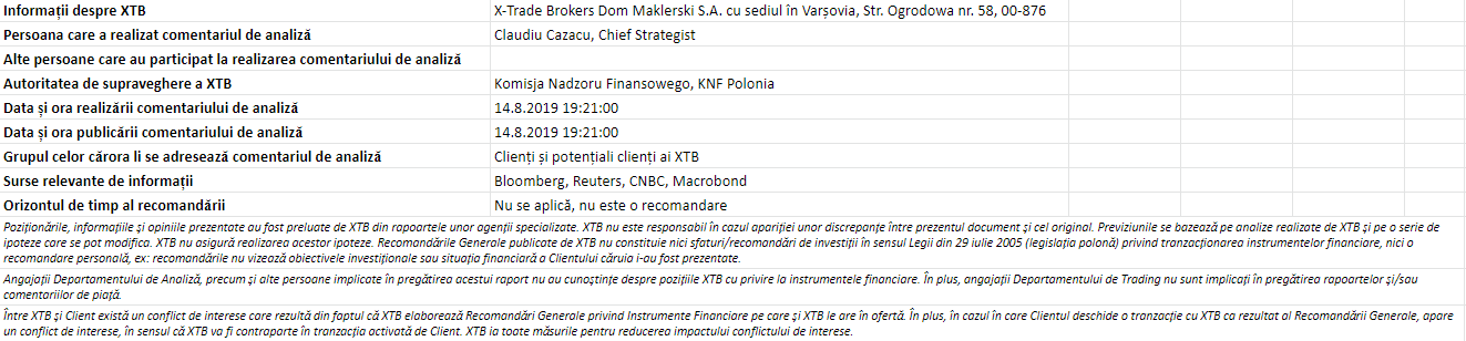 "Acest material este o comunicare de marketing în sensul articolului 24 alineatul (3) din Directiva 2014/65 / UE a Parlamentului European și a Consiliului din 15 mai 2014 privind piețele de instrumente financiare, și de modificare a Directivei 2002/92 / CE și a Directivei 2011 / 61 / UE (MiFID II). Comunicarea de marketing nu este o recomandare de investiții sau o recomandare de informații sau o recomandare care sugerează o strategie de investiții în sensul Regulamentului (UE) nr. 596/2014 al Parlamentului European și al Consiliului din 16 aprilie 2014 privind abuzul de piață ( reglementarea abuzului de piață) și de abrogare a Directivei 2003/6 / CE a Parlamentului European și a Consiliului și a Directivelor Comisiei 2003/124 / CE, 2003/125 / CE și 2004/72 / CE și a Regulamentului delegat (UE) 2016/958 al Comisiei din 9 596/2014 al Parlamentului European și al Consiliului în ceea ce privește standardele tehnice de reglementare pentru aranjamentele tehnice pentru prezentarea obiectivă a recomandărilor de investiții sau a altor informații care sugerează strategii de investiții și pentru dezvăluirea de interese particulare sau indicații de conflicte de interese sau orice alte sfaturi, inclusiv în domeniul consultanței în materie de investiții, în sensul Legii privind tranzacționarea cu instrumente financiare din 29 iulie 2005 (de ex. Journal of Laws 2019, articolul 875, astfel cum a fost modificat). Comunicarea de marketing este pregătită cu cea mai mare diligență, obiectivitate, prezintă faptele cunoscute autorului la data pregătirii și este lipsită de orice elemente de evaluare. Comunicarea de marketing este pregătită fără a lua în considerare nevoile clientului, situația sa financiară individuală și nu prezintă nicio strategie de investiții în niciun fel. Comunicarea de marketing nu constituie o ofertă de vânzare, oferire, abonament, invitație la cumpărare, reclamă sau promovare a oricărui instrument financiar. XTB SA nu este responsabilă pentru acțiunile sau omisiunile niciunui client, în special pentru achiziționarea sau cedarea instrumente, întreprinse pe baza informațiilor conținute în această comunicare de marketing. XTB SA nu va accepta răspunderea pentru nicio pierdere sau daună, inclusiv, fără limitare, orice pierdere care poate apărea direct sau indirect, efectuată pe baza informațiilor conținute în această comunicare de marketing. În cazul în care comunicarea de marketing conține informații despre orice rezultat cu privire la instrumentele financiare indicate în acestea, acestea nu constituie nicio garanție sau prognoză cu privire la rezultatele viitoare. Performanțele anterioare nu indică neapărat rezultatele viitoare și orice persoană care acționează pe baza acestor informații o face pe propriul risc. Acest material nu este emis pentru a influenta deciziile de tranzacționare ale niciunei persoane. Informațiile cuprinse în cadrul acestui material nu sunt prezentate pentru a fi aplicate, copiate sau testate în cadrul tranzacțiilor dumneavoastră. Informațiile cuprinse în cadrul acestui material sunt emise în baza experienței proprii a emitentului și nu reprezintă o recomandare individuală, nu vizează atingerea anumitor obiective, randamente financiare și nu se adresează nevoilor niciunei persoane anume care ar primi-o. Premisele acestui material nu au în vedere situația și persoana dumneavoastră deci nu recomandăm utilizarea acestor informații sub orice formă. Utilizarea informațiilor cuprinse în cadrul acestui material în orice modalitate se face pe propria dumneavoastră răspundere. Acest material este emis de către un analist pentru care își asumă răspunderea XTB SA, persoană juridică autorizată de KNF – Autoritatea de Supraveghere Financiara din Polonia."