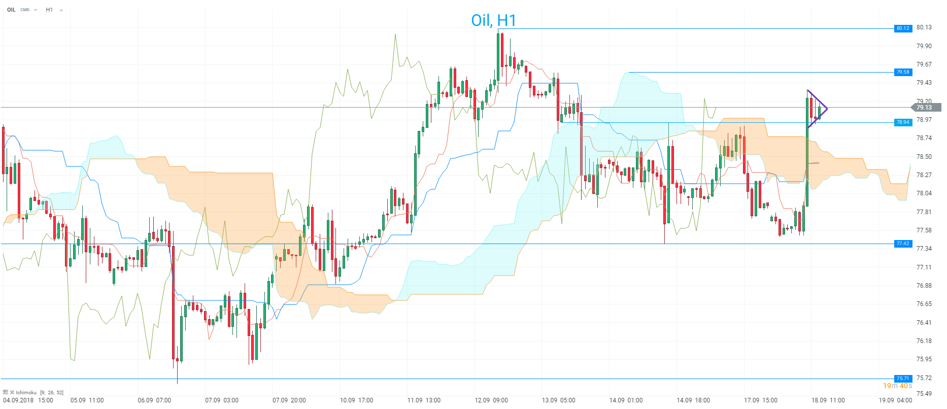 Unul dintre cele mai active instrumente ale zilei este OIL, al cărui preț s-a apreciat semnificativ după comentariile OPEC și ale Arabiei Saudite. Cotația a câștigat 140 de pips într-o oră, depășind, ca amplitudine, spike-ul de vineri și sugerând interesul crescut de cumpărare al traderilor. Pe graficul H1, prețul a revenit deasupra norului Ichimoku, care poate indica o inversare a trendului pe termen scurt. Mișcarea de consolidare recentă a dezvoltat o formațiune de steag bullish.