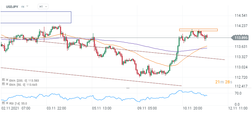 Pentru ca prețul să se stabilizeze deasupra pragului 114, ar fi necesară depășirea zonei locale de rezistență 114,100 - 114,150 (dreptunghiul portocaliu). În cazul în care vom vedea o reducere a încrederii în impulsul ascendent, ar putea avea loc o corecție către zona de la 113,560, unde se intersectează cele două medii mobile, de 50 și 200 de perioade (liniile portocalii și mov).