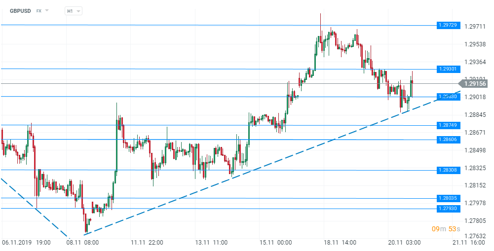 Astfel, acest context a fost nefavorabil pentru GBPUSD care a suferit o corecție din apropierea nivelului de rezistență de la 1,29729 până la testarea liniei ascendente de trend din zona 1,28879. Acest suport s-a dovedit dificil de depășit de către vânzători, iar prețul a ricoșat deasupra barierei de la 1,29030. Astfel, ne aflăm în continuare pe un trend ascendent început pe 8 noiembrie, scenariu care, pe un interval mai extins de timp, este pozitiv pentru cumpărători. Ținând cont că în această seară, la 9:00 pm ora României, se vor publica Minutele FOMC, care ar putea determina un nivel ridicat de volatilitate la nivelul perechii, este posibil să vedem dacă vânzătorii vor primi argumentele necesare pentru întreruperea impulsului ascendent și declanșarea unei secvențe de scădere.