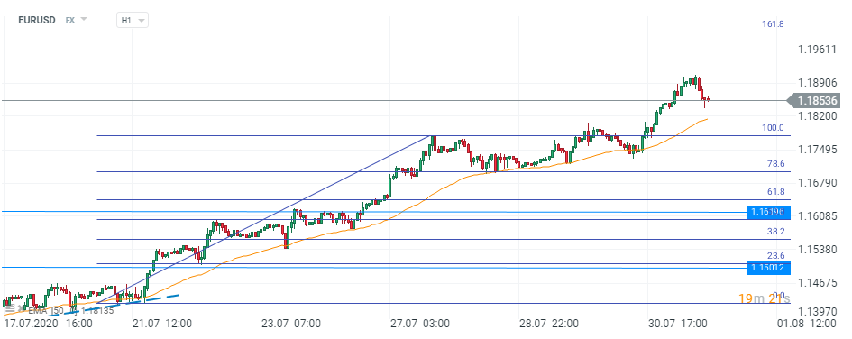 Indicele dolarului a scăzut până la 92,546, nivel observat ultima dată în mai 2018. Acesta a scăzut cu 4,9% în iulie, iar cea mai mare parte a scăderii a avut loc în ultimele 10 zile odată cu apariția unei accelerări a ritmului de creștere a noilor cazuri la nivelul mai multor state americane, iar datele macroeconomice recente au indicat o oboseală a ritmului de recuperare economică.