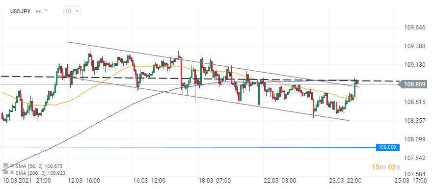 O spargere a limitei inferioare a canalului descendent ar putea să deschidă drumul unei potențiale reluări a mișcării descendente. Cu toate acestea, pentru moment, mișcarea bullish pare a fi destul de solidă, prețul depășind două rezistențe cheie: media mobilă de 50 de perioade (linia galbenă) și o zonă cheie de rezistență. În acest interval se regăsește un mix de trei niveluri tehnice importante: media mobilă de 200 de perioade (linia albastră), limita superioară a canalului de scădere și nivelul de rezistență de la 108,900. Pentru moment, încrederea cumpărătorilor ar putea să aibă de suferit având în vedere că aici se regăsește și limita superioară a canalului descendent pe termen lung (linia punctată neagră).