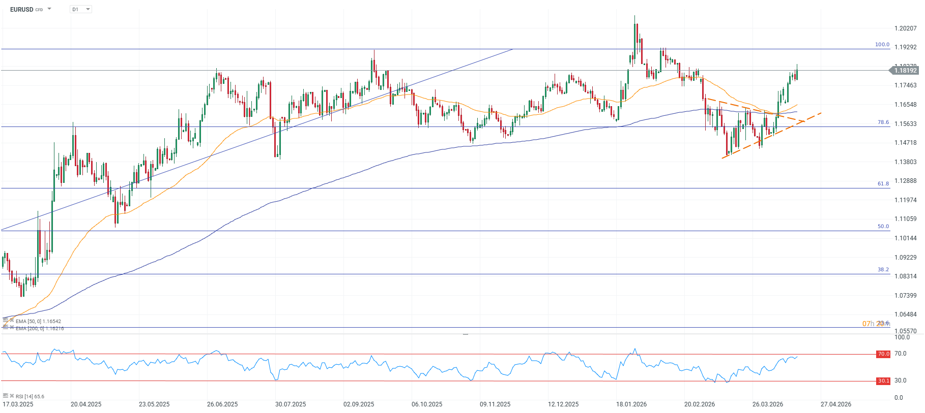 Odată cu izbucnirea războiului cu Iranul, a reapărut discuția despre o potențială paritate euro-dolar în cazul unei opriri permanente a redresării economice în Europa. Cu toate acestea, piața a anticipat rapid o revenire la normalitate, iar EURUSD și-a reluat ofensiva la scurt timp după ce a depășit minimul local de la 1,1400. În prezent, cursul se situează peste 1,18 și se tranzacționează la nivelurile de dinaintea conflictului din Orientul Mijlociu, când principala perspectivă era presupunerea pieței privind o revenire la reducerile ratei dobânzii din SUA.