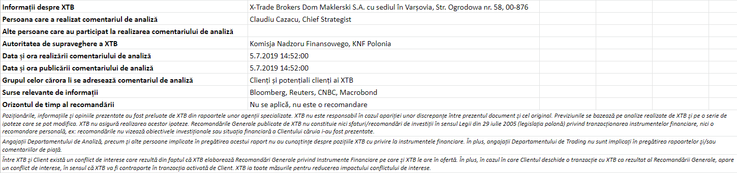 "Acest material este o comunicare de marketing în sensul articolului 24 alineatul (3) din Directiva 2014/65 / UE a Parlamentului European și a Consiliului din 15 mai 2014 privind piețele de instrumente financiare, și de modificare a Directivei 2002/92 / CE și a Directivei 2011 / 61 / UE (MiFID II). Comunicarea de marketing nu este o recomandare de investiții sau o recomandare de informații sau o recomandare care sugerează o strategie de investiții în sensul Regulamentului (UE) nr. 596/2014 al Parlamentului European și al Consiliului din 16 aprilie 2014 privind abuzul de piață ( reglementarea abuzului de piață) și de abrogare a Directivei 2003/6 / CE a Parlamentului European și a Consiliului și a Directivelor Comisiei 2003/124 / CE, 2003/125 / CE și 2004/72 / CE și a Regulamentului delegat (UE) 2016/958 al Comisiei din 9 596/2014 al Parlamentului European și al Consiliului în ceea ce privește standardele tehnice de reglementare pentru aranjamentele tehnice pentru prezentarea obiectivă a recomandărilor de investiții sau a altor informații care sugerează strategii de investiții și pentru dezvăluirea de interese particulare sau indicații de conflicte de interese sau orice alte sfaturi, inclusiv în domeniul consultanței în materie de investiții, în sensul Legii privind tranzacționarea cu instrumente financiare din 29 iulie 2005 (de ex. Journal of Laws 2019, articolul 875, astfel cum a fost modificat). Comunicarea de marketing este pregătită cu cea mai mare diligență, obiectivitate, prezintă faptele cunoscute autorului la data pregătirii și este lipsită de orice elemente de evaluare. Comunicarea de marketing este pregătită fără a lua în considerare nevoile clientului, situația sa financiară individuală și nu prezintă nicio strategie de investiții în niciun fel. Comunicarea de marketing nu constituie o ofertă de vânzare, oferire, abonament, invitație la cumpărare, reclamă sau promovare a oricărui instrument financiar. XTB SA nu este responsabilă pentru acțiunile sau omisiunile niciunui client, în special pentru achiziționarea sau cedarea instrumente, întreprinse pe baza informațiilor conținute în această comunicare de marketing. XTB SA nu va accepta răspunderea pentru nicio pierdere sau daună, inclusiv, fără limitare, orice pierdere care poate apărea direct sau indirect, efectuată pe baza informațiilor conținute în această comunicare de marketing. În cazul în care comunicarea de marketing conține informații despre orice rezultat cu privire la instrumentele financiare indicate în acestea, acestea nu constituie nicio garanție sau prognoză cu privire la rezultatele viitoare. Performanțele anterioare nu indică neapărat rezultatele viitoare și orice persoană care acționează pe baza acestor informații o face pe propriul risc. Acest material nu este emis pentru a influenta deciziile de tranzacționare ale niciunei persoane. Informațiile cuprinse în cadrul acestui material nu sunt prezentate pentru a fi aplicate, copiate sau testate în cadrul tranzacțiilor dumneavoastră. Informațiile cuprinse în cadrul acestui material sunt emise în baza experienței proprii a emitentului și nu reprezintă o recomandare individuală, nu vizează atingerea anumitor obiective, randamente financiare și nu se adresează nevoilor niciunei persoane anume care ar primi-o. Premisele acestui material nu au în vedere situația și persoana dumneavoastră deci nu recomandăm utilizarea acestor informații sub orice formă. Utilizarea informațiilor cuprinse în cadrul acestui material în orice modalitate se face pe propria dumneavoastră răspundere. Acest material este emis de către un analist pentru care își asumă răspunderea XTB SA, persoană juridică autorizată de KNF – Autoritatea de Supraveghere Financiara din Polonia."