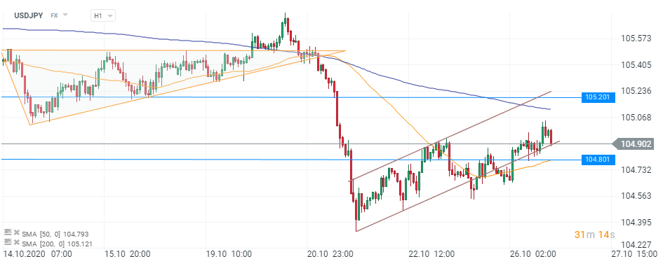 Din punct de vedere grafic, perechea USDJPY a evoluat în interiorul unui canal de creștere de săptămâna trecută, după atingerea minimelor din ultima lună. Secvența actuală reprezintă o revenire a dolarului ca urmare a unei corecții ample suferite pe fondul unui scenariu negativ pentru USD. Totuși, având în vedere că ne aflăm la doar o săptămână de alegerile prezidențiale din SUA, încrederea investitorilor în dolarul american, chiar și într-un astfel de context incert și cu un grad ridicat de aversiune față de risc, s-ar putea reduce. Optimismul cumpărătorilor pare deja să dea semne de oboseală, prețul evoluând foarte aproape de limita inferioară a canalului. În cazul unei spargeri descendente, primul nivel de urmărit ar fi 104,800, care în trecut a acționat și ca o rezistență. Această zonă ar putea fi mai solidă, fiind susținută și de o medie mobilă de 50 de perioade. În caz contrar, extinderea mișcării actuale ar putea împinge cotația către obiectivul de la 105,200.