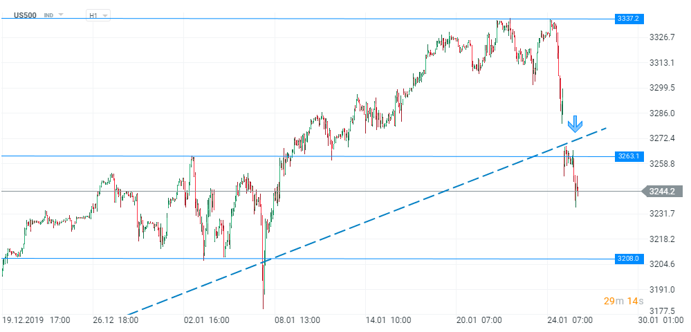 Îngrijorarea investitorilor a pus presiune descendentă asupra cotației US500. Gap-ul descendent de la începutul sesiunii de luni a dus prețul sub linia ascendentă de trend, scenariu care ar putea pune în pericol tendința de creștere pe termen lung. Sursa: xStation5
