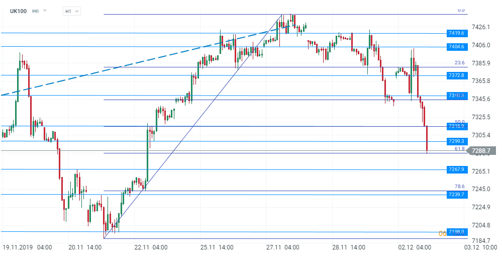 UK100 a început ziua în aceeași notă cu restul piețelor, dar ulterior a traversat un grad destul de ridicat de volatilitate. Optimismul inițial a fost determinat de datele PMI peste așteptări din China, care au alimentat speranțele investitorilor cu privire la posibilitatea unei redresări economice, aceștia previzionând că odată cu semnarea unui acord între China și SUA situația se va îmbunătăți semnificativ. Ulterior, apetitul pentru risc a fost menținut și de seria de date PMI bune la nivelul sectorului manufacturier din statele din Zona Euro dar și la nivel agregat, dar mai ales de rezultatele din Marea Britanie. Raportul PMI final pentru noiembrie a adus o îmbunătățire față de nivelul previzionat (48,3), înregistrând un nivel de 48,9. Totuși, tot acest entuziasm a fost rapid alungat de către Președintele Donald Trump care a adus acuze pe Twitter Braziliei și Argentinei cu privire la manipularea monedei și a anunțat că va restabili taxe vamale asupra importurilor de oțel și aluminiu din cele două state. Comentariul său a indicat un ton laudativ față de tarifele impuse Chinei, aspect ce a redus semnificativ speranțele cu privire la un acord. Acest anunț a reprezentat un șoc pentru piețe, investitorii monitorizând activ evoluțiile de pe plan comercial iar orice informație tinzând să aibă o importanță accentuată întrucât ne apropiem de 15 decembrie, data limită la care urmează să intre în vigoare noi taxe vamale.