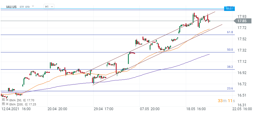 Conform datelor Ultumus, cel mai mare ETP cu activ suport pe aur din Europa, iShares Physical Gold ETC (IAU.US pe xStation5) cu o valoare totală de 13,9 miliarde dolari, a colectat active de 356 milioane de dolari în săptămâna care s-a încheiat pe 14 mai.