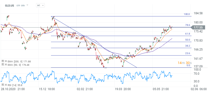 Analizând graficul H1 al ETF-ului, observăm că prețul a depășit un nivel de rezistență interesant la 177,50, care este susținut de o retragere Fibonacci de 78,6% din secvența corectivă din perioada ianuarie - martie 2021. Această zonă a întrerupt mai multe încercări de avans în trecut, prin urmare cumpărătorii ar putea întâmpina opoziție. Din punct de vedere al indicatorului de moment RSI, nu par să existe motive de îngrijorare, iar cele două medii mobile, de 50 și 200 de perioade (liniile portocalii și albastre) oferă susținere mișcării.