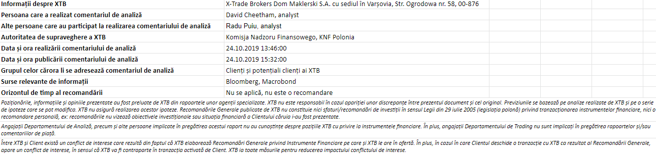 "Acest material este o comunicare de marketing în sensul articolului 24 alineatul (3) din Directiva 2014/65 / UE a Parlamentului European și a Consiliului din 15 mai 2014 privind piețele de instrumente financiare, și de modificare a Directivei 2002/92 / CE și a Directivei 2011 / 61 / UE (MiFID II). Comunicarea de marketing nu este o recomandare de investiții sau o recomandare de informații sau o recomandare care sugerează o strategie de investiții în sensul Regulamentului (UE) nr. 596/2014 al Parlamentului European și al Consiliului din 16 aprilie 2014 privind abuzul de piață ( reglementarea abuzului de piață) și de abrogare a Directivei 2003/6 / CE a Parlamentului European și a Consiliului și a Directivelor Comisiei 2003/124 / CE, 2003/125 / CE și 2004/72 / CE și a Regulamentului delegat (UE) 2016/958 al Comisiei din 9 596/2014 al Parlamentului European și al Consiliului în ceea ce privește standardele tehnice de reglementare pentru aranjamentele tehnice pentru prezentarea obiectivă a recomandărilor de investiții sau a altor informații care sugerează strategii de investiții și pentru dezvăluirea de interese particulare sau indicații de conflicte de interese sau orice alte sfaturi, inclusiv în domeniul consultanței în materie de investiții, în sensul Legii privind tranzacționarea cu instrumente financiare din 29 iulie 2005 (de ex. Journal of Laws 2019, articolul 875, astfel cum a fost modificat). Comunicarea de marketing este pregătită cu cea mai mare diligență, obiectivitate, prezintă faptele cunoscute autorului la data pregătirii și este lipsită de orice elemente de evaluare. Comunicarea de marketing este pregătită fără a lua în considerare nevoile clientului, situația sa financiară individuală și nu prezintă nicio strategie de investiții în niciun fel. Comunicarea de marketing nu constituie o ofertă de vânzare, oferire, abonament, invitație la cumpărare, reclamă sau promovare a oricărui instrument financiar. XTB SA nu este responsabilă pentru acțiunile sau omisiunile niciunui client, în special pentru achiziționarea sau cedarea instrumente, întreprinse pe baza informațiilor conținute în această comunicare de marketing. XTB SA nu va accepta răspunderea pentru nicio pierdere sau daună, inclusiv, fără limitare, orice pierdere care poate apărea direct sau indirect, efectuată pe baza informațiilor conținute în această comunicare de marketing. În cazul în care comunicarea de marketing conține informații despre orice rezultat cu privire la instrumentele financiare indicate în acestea, acestea nu constituie nicio garanție sau prognoză cu privire la rezultatele viitoare. Performanțele anterioare nu indică neapărat rezultatele viitoare și orice persoană care acționează pe baza acestor informații o face pe propriul risc. Acest material nu este emis pentru a influenta deciziile de tranzacționare ale niciunei persoane. Informațiile cuprinse în cadrul acestui material nu sunt prezentate pentru a fi aplicate, copiate sau testate în cadrul tranzacțiilor dumneavoastră. Informațiile cuprinse în cadrul acestui material sunt emise în baza experienței proprii a emitentului și nu reprezintă o recomandare individuală, nu vizează atingerea anumitor obiective, randamente financiare și nu se adresează nevoilor niciunei persoane anume care ar primi-o. Premisele acestui material nu au în vedere situația și persoana dumneavoastră deci nu recomandăm utilizarea acestor informații sub orice formă. Utilizarea informațiilor cuprinse în cadrul acestui material în orice modalitate se face pe propria dumneavoastră răspundere. Acest material este emis de către un analist pentru care își asumă răspunderea XTB SA, persoană juridică autorizată de KNF – Autoritatea de Supraveghere Financiara din Polonia."