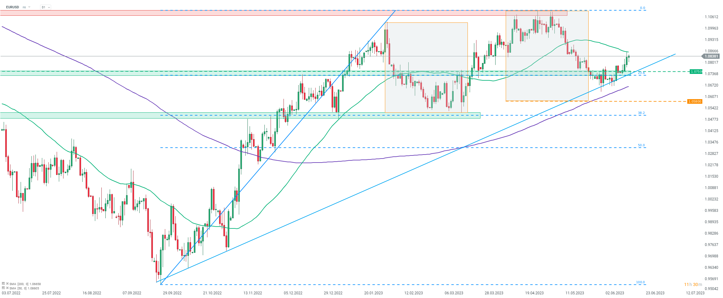 EURUSD a încercat ieri să depășească media mobilă de 50 de ședințe (linia verde), dar nu a reușit deoarece dolarul a recuperat teren în urma deciziei FOMC. Cu toate acestea, eșecul de a depăși media mobilă menționată mai sus nu a schimbat peisajul tehnic - secvența ascendentă de trend este încă prezentă pe grafic, iar o recentă revenire de pe linia de trend pe termen mediu a confirmat impulsul de creștere. O surpriză de tip hawkish, în ceea ce privește o prognoză mai mare a inflației sau o orientare viitoare mai agresivă, ar putea oferi sprijin pentru pereche și un combustibil pentru o nouă testare a mediei mobile de 50 de ședințe. Pe de altă parte, în cazul în care BCE a trimis un mesaj dovish, suportul pe termen scurt care trebuie urmărit este o zonă cuprinsă între nivelul 1,0750 și o retragere Fibonacci de 23,6% a impulsului ascendent lansat în septembrie 2022.