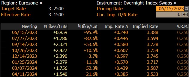 Piețele monetare previzionează încă două majorări ale ratei BCE până la sfârșitul anului. Sursa: Bloomberg