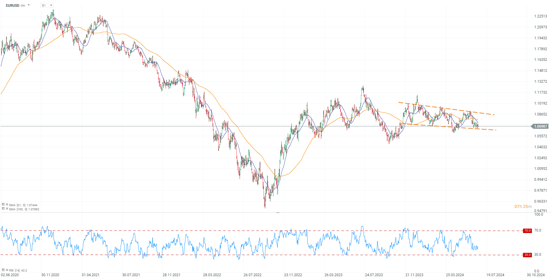 Analizând graficul, observăm că perechea EURUSD a evoluat în interiorul unui canal descendent de trend de la sfârșitul lunii noiembrie a anului trecut. De la jumătatea lunii iunie, cotația a performat în vecinătatea limitei inferioare a canalului. Reducere impulsului mișcării actuale se observă prin faptul că prețul se află sub cele două medii mobile de 21 și 100 de perioade (dreptele albastre și portocalii). Nivelul 1,067 a fost testat fără succes de trei ori până acum în această lună, fapt ce îi oferă o importanță semnificativă, motiv pentru care prețul nu este așteptat să scadă sub această valoare fără un factor fundamental major.