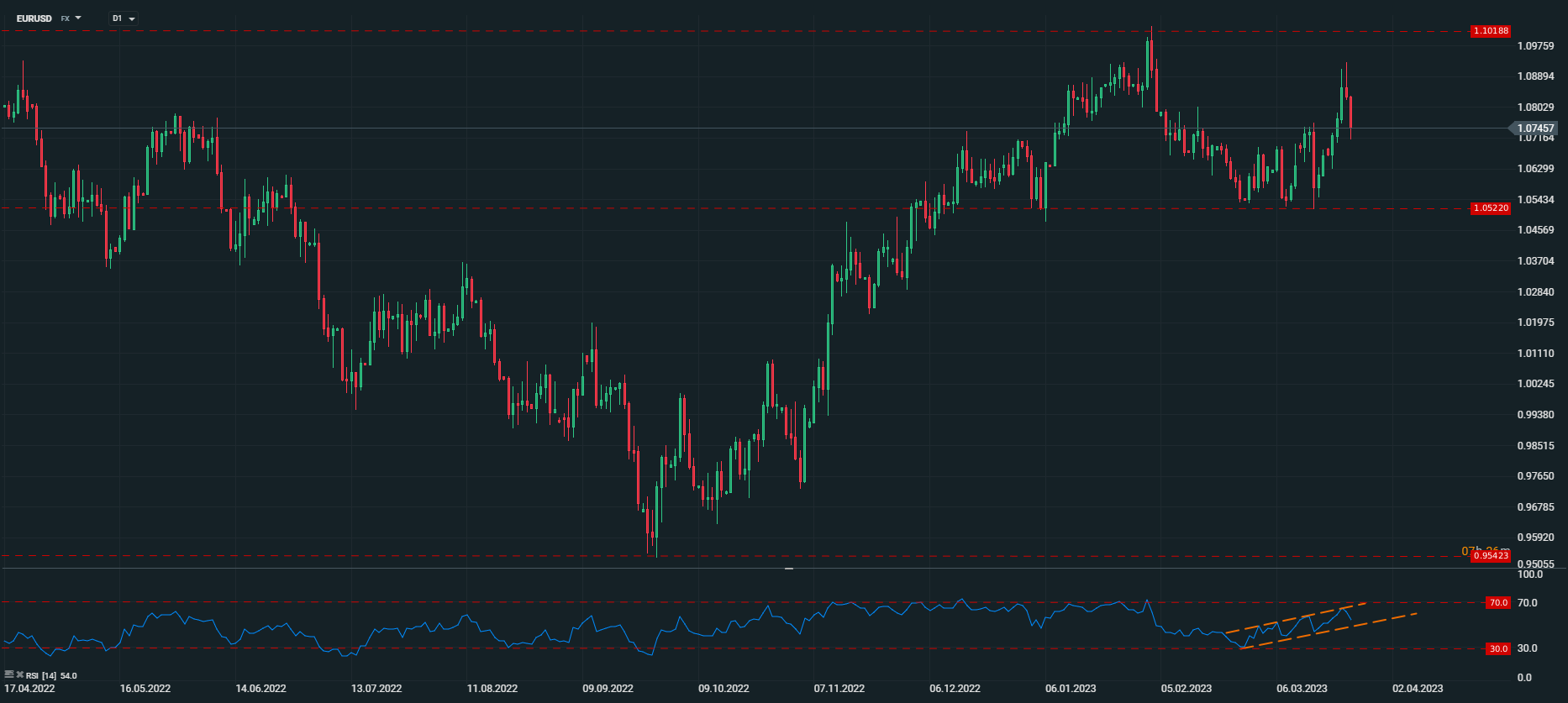 Într-un context în care aversiunea față de risc s-a accentuat o dată cu temerile apărute în sectorul bancar, moneda euro a scăzut sub nivelul de suport de la 1,08 USD înainte ca datele PMI din Zona Euro să fie publicate în această dimineață. Această dinamică vine după ce USD a încheiat 5 zile consecutive de slăbiciune, indicele dolarului american reușind să revină. Indicatorul RSI ne arată un trend ascendent, valoarea actuală plasându-se în vecinătatea zonei neutre de 50 de puncte, la 54 de puncte. Prin urmare, o potențială spargere a limitei inferioare a canalului poate anula impulsul ascendent. Nivelul de suport de urmărit este 1,05220.