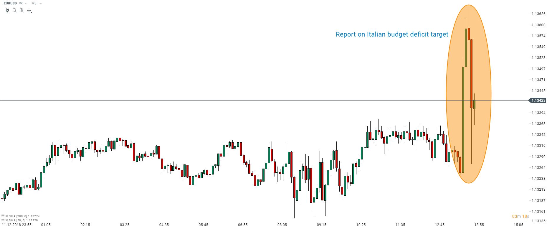 Cotația EURUSD s-a apreciat până la un nou maxim de 1.1364 datorită raportului propus de Italia. Acesta sugerează ca ținta deficitului bugetar să atingă 2%. Totuși, cea mai importantă pereche valutară a corectat o parte din câștiguri. Sursa: xStation5