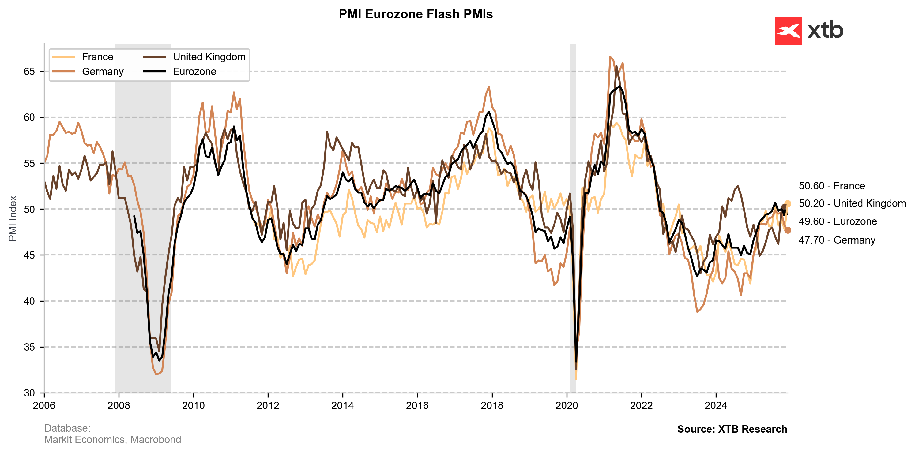 - Stabilitatea fragilă a Franței: Franța prezintă o imagine mixtă: stabilizarea industrială este pozitivă, dar sectorul serviciilor pierde rapid din avânt. Activitatea compozită franceză (50,1) semnalează un echilibru precar între expansiune și stagnare. În ciuda dificultăților politice interne, natura expansionistă a indicelui manufacturier este o evoluție binevenită.