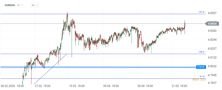 Acest scenariu a favorizat aprecierea EURRON care a atins un maxim intraday la 4,8490. În cadrul secvenței de creștere, a fost depășit nivelul local de rezistență de la 4,8425 care a acționat ca un plafon pentru perechea valutară în ultimele două săptămâni. Acest prag a reușit să întrerupă orice încercare de apreciere din ultima perioadă, dar trebuie menționat că moneda unică europeană nu a beneficiat de un context atât de favorabil până acum. Ulterior, cotația a pierdut o parte din câștiguri pe fondul unei corecții extinse a euro, care ar putea fi justificată de o tendință de marcare a profitului înainte de venirea weekendului. Perspectivele acestei perechi depind de închiderea de astăzi. Dacă vom asista la o închidere zilnică și săptămânală deasupra barierei depășite anterior, am putea asista la un val de încredere la nivelul cumpărătorilor care să impulsioneze prețul. În caz contrar, am putea asista la o continuare a secvenței laterale sub nivelul 4,8425.