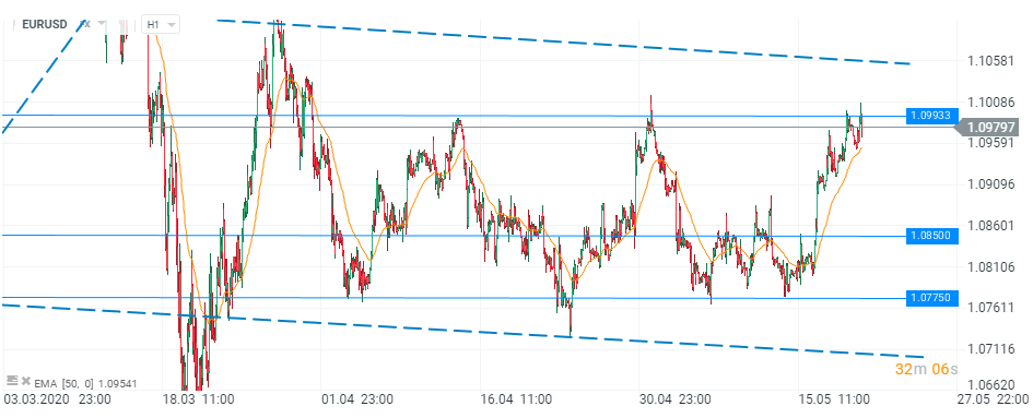 Principalul instrument influențat de rapoarte a fost perechea valutară EURUSD. Moneda unică europeană a reușit deja o recuperare remarcabilă în raport cu dolarul, atingând cel mai ridicat nivel de la începutul lunii mai. Perspectivele optimiste ale investitorilor cu privire la un posibil plan de recuperare economică la nivel european au reprezentat principalul motor ce a stat la baza creșterii. În acest context, euro a reușit să profite și de perioada mai slabă a dolarului american și a testat limita superioară a intervalului de tranzacționare în interiorul căruia a evoluat de la începutul lunii aprilie. Totuși, nivelul de la 1,09933 s-a dovedit a fi prea puternic pentru cumpărători în acest moment, având loc un ricoșeu destul de puternic. Perspectivele nu sunt tocmai îmbucurătoare pentru euro, mai ales dacă avem în vedere și trendul pe termen lung care este unul descendent. În eventualitatea în care așteptările ce indică o recuperare economică mai lentă se vor îndeplini, investitorii s-ar putea reorienta către active de refugiu precum titlurile de stat americane sau USD, lucru ce ar putea duce la o cerere crescută pentru monedă. În plus, în ciuda revenirii actuale, activitatea economică din Zona Euro rămâne destul de scăzută în ciuda relaxării restricțiilor, factor negativ pentru moneda unică europeană. Primul nivel de suport ar putea fi sub forma mediei mobile exponențiale de 50 de perioade în zona 1,09550, dar principalul suport este limita inferioară a canalului de la 1,07750.