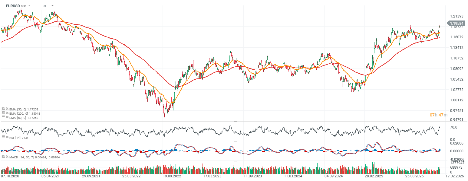 EURUSD crește astăzi, impulsionat de slăbirea dolarului american și de o posibilă politică monetară relaxată a Fed în 2026, Rick Rieder de la BlackRock având șanse de aproape 50% să devină noul președinte al Fed după Jerome Powell.