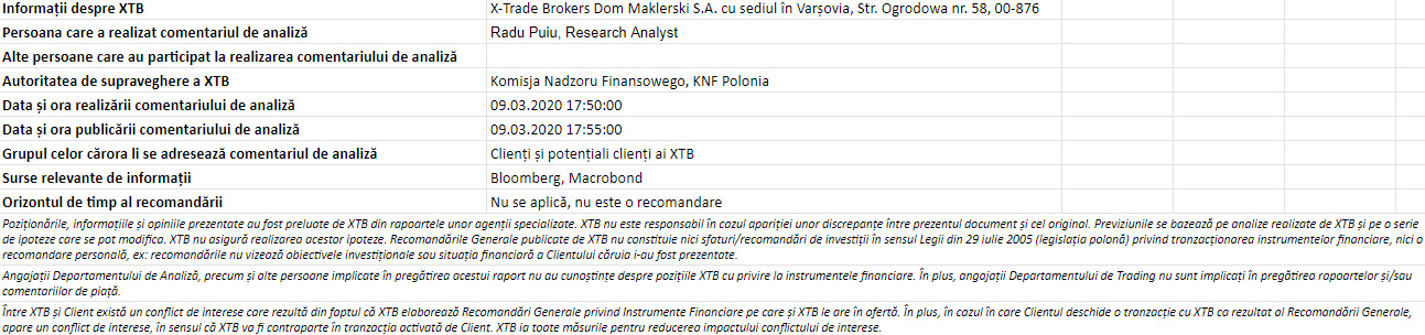"Acest material este o comunicare de marketing în sensul articolului 24 alineatul (3) din Directiva 2014/65 / UE a Parlamentului European și a Consiliului din 15 mai 2014 privind piețele de instrumente financiare, și de modificare a Directivei 2002/92 / CE și a Directivei 2011 / 61 / UE (MiFID II). Comunicarea de marketing nu este o recomandare de investiții sau o recomandare de informații sau o recomandare care sugerează o strategie de investiții în sensul Regulamentului (UE) nr. 596/2014 al Parlamentului European și al Consiliului din 16 aprilie 2014 privind abuzul de piață ( reglementarea abuzului de piață) și de abrogare a Directivei 2003/6 / CE a Parlamentului European și a Consiliului și a Directivelor Comisiei 2003/124 / CE, 2003/125 / CE și 2004/72 / CE și a Regulamentului delegat (UE) 2016/958 al Comisiei din 9 596/2014 al Parlamentului European și al Consiliului în ceea ce privește standardele tehnice de reglementare pentru aranjamentele tehnice pentru prezentarea obiectivă a recomandărilor de investiții sau a altor informații care sugerează strategii de investiții și pentru dezvăluirea de interese particulare sau indicații de conflicte de interese sau orice alte sfaturi, inclusiv în domeniul consultanței în materie de investiții, în sensul Legii privind tranzacționarea cu instrumente financiare din 29 iulie 2005 (de ex. Journal of Laws 2019, articolul 875, astfel cum a fost modificat). Comunicarea de marketing este pregătită cu cea mai mare diligență, obiectivitate, prezintă faptele cunoscute autorului la data pregătirii și este lipsită de orice elemente de evaluare. Comunicarea de marketing este pregătită fără a lua în considerare nevoile clientului, situația sa financiară individuală și nu prezintă nicio strategie de investiții în niciun fel. Comunicarea de marketing nu constituie o ofertă de vânzare, oferire, abonament, invitație la cumpărare, reclamă sau promovare a oricărui instrument financiar. XTB SA nu este responsabilă pentru acțiunile sau omisiunile niciunui client, în special pentru achiziționarea sau cedarea instrumente, întreprinse pe baza informațiilor conținute în această comunicare de marketing. XTB SA nu va accepta răspunderea pentru nicio pierdere sau daună, inclusiv, fără limitare, orice pierdere care poate apărea direct sau indirect, efectuată pe baza informațiilor conținute în această comunicare de marketing. În cazul în care comunicarea de marketing conține informații despre orice rezultat cu privire la instrumentele financiare indicate în acestea, acestea nu constituie nicio garanție sau prognoză cu privire la rezultatele viitoare. Performanțele anterioare nu indică neapărat rezultatele viitoare și orice persoană care acționează pe baza acestor informații o face pe propriul risc. Acest material nu este emis pentru a influenta deciziile de tranzacționare ale niciunei persoane. Informațiile cuprinse în cadrul acestui material nu sunt prezentate pentru a fi aplicate, copiate sau testate în cadrul tranzacțiilor dumneavoastră. Informațiile cuprinse în cadrul acestui material sunt emise în baza experienței proprii a emitentului și nu reprezintă o recomandare individuală, nu vizează atingerea anumitor obiective, randamente financiare și nu se adresează nevoilor niciunei persoane anume care ar primi-o. Premisele acestui material nu au în vedere situația și persoana dumneavoastră deci nu recomandăm utilizarea acestor informații sub orice formă. Utilizarea informațiilor cuprinse în cadrul acestui material în orice modalitate se face pe propria dumneavoastră răspundere. Acest material este emis de către un analist pentru care își asumă răspunderea XTB SA, persoană juridică autorizată de KNF – Autoritatea de Supraveghere Financiara din Polonia."