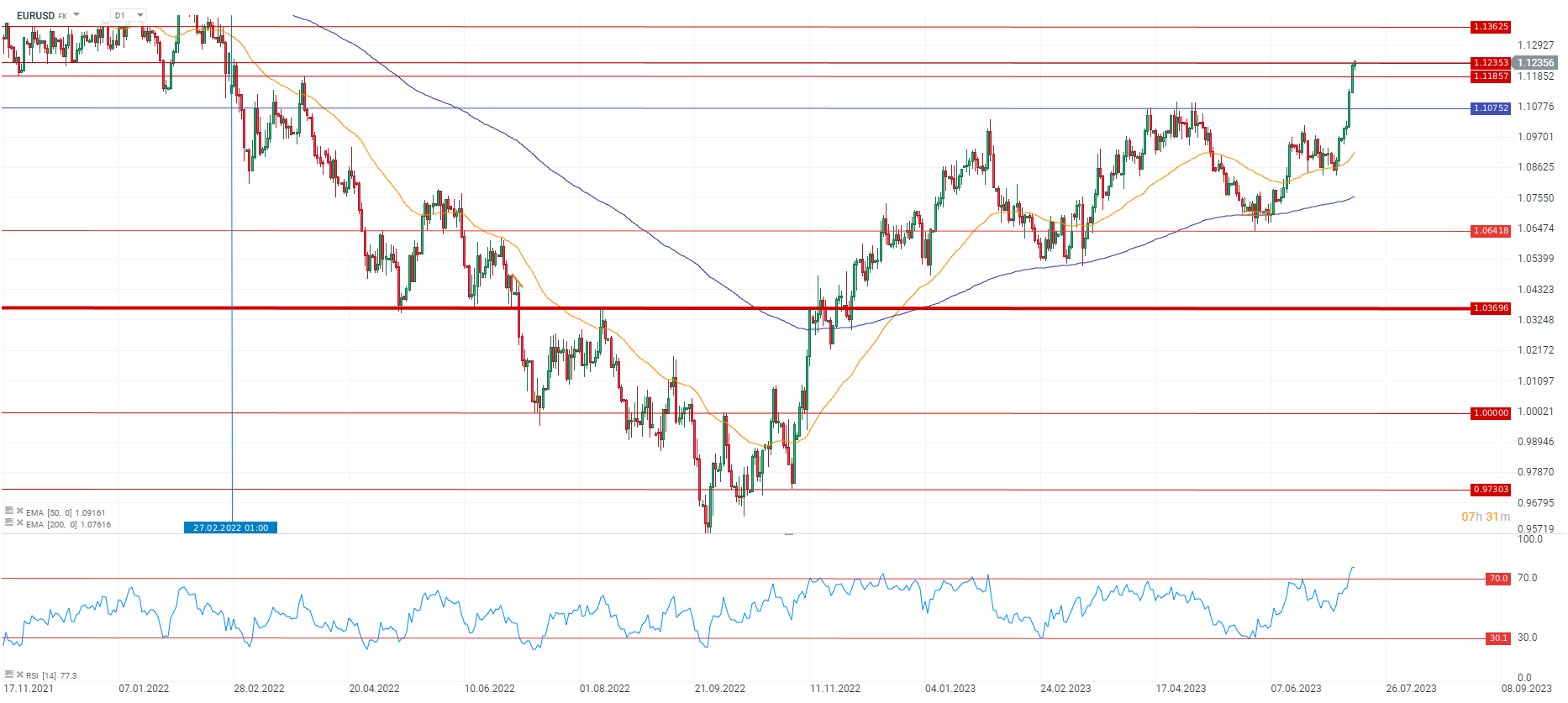Perspectiva EURUSD a rămas pozitivă deoarece a depășit pragul de 1,12, dolarul continuând să scadă pentru a șasea zi consecutivă față de un coș de valute străine. Între timp, indicele dolarului a spart sub zona de 100,00. Investitorii s-au convins și mai mult că luna iulie va marca sfârșitul ciclului de majorare a ratelor de către Fed, după ce cele mai recente date privind inflația au indicat o slăbire a presiunilor asupra prețurilor.