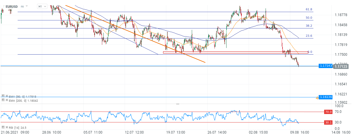 Din punct de vedere tehnic, cotația se află într-un punct cheie: testează nivelul de susținere de la 1,17143 care reprezintă minimul din martie anul curent. În cazul unei spargeri, spațiul de evoluție este destul de permisiv, următorul nivel relevant fiind la 1,16136 care este susținut de două minime atinse în septembrie și noiembrie 2020. Indicatorul de sentiment RSI a scăzut în zona de supravânzare și, dacă ar fi să ținem cont de evoluția din trecutul recent, niciun astfel de scenariu nu a fost de durată, etalonul revenind rapid deasupra limitei inferioare de 30 de puncte. Prin urmare, există posibilitatea de stabilire a perechii, cel puțin pentru moment, având în vedere importanța acestui suport.